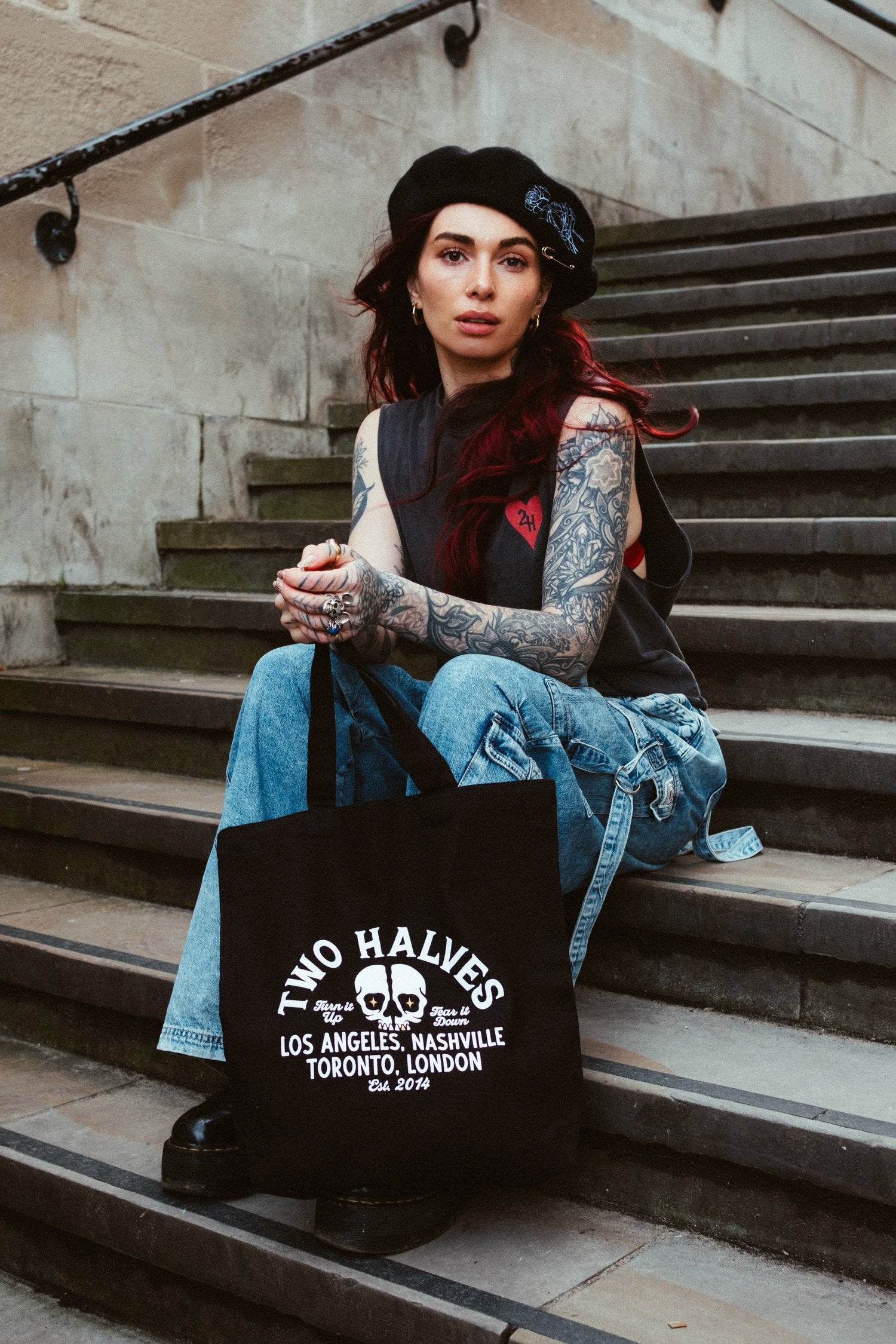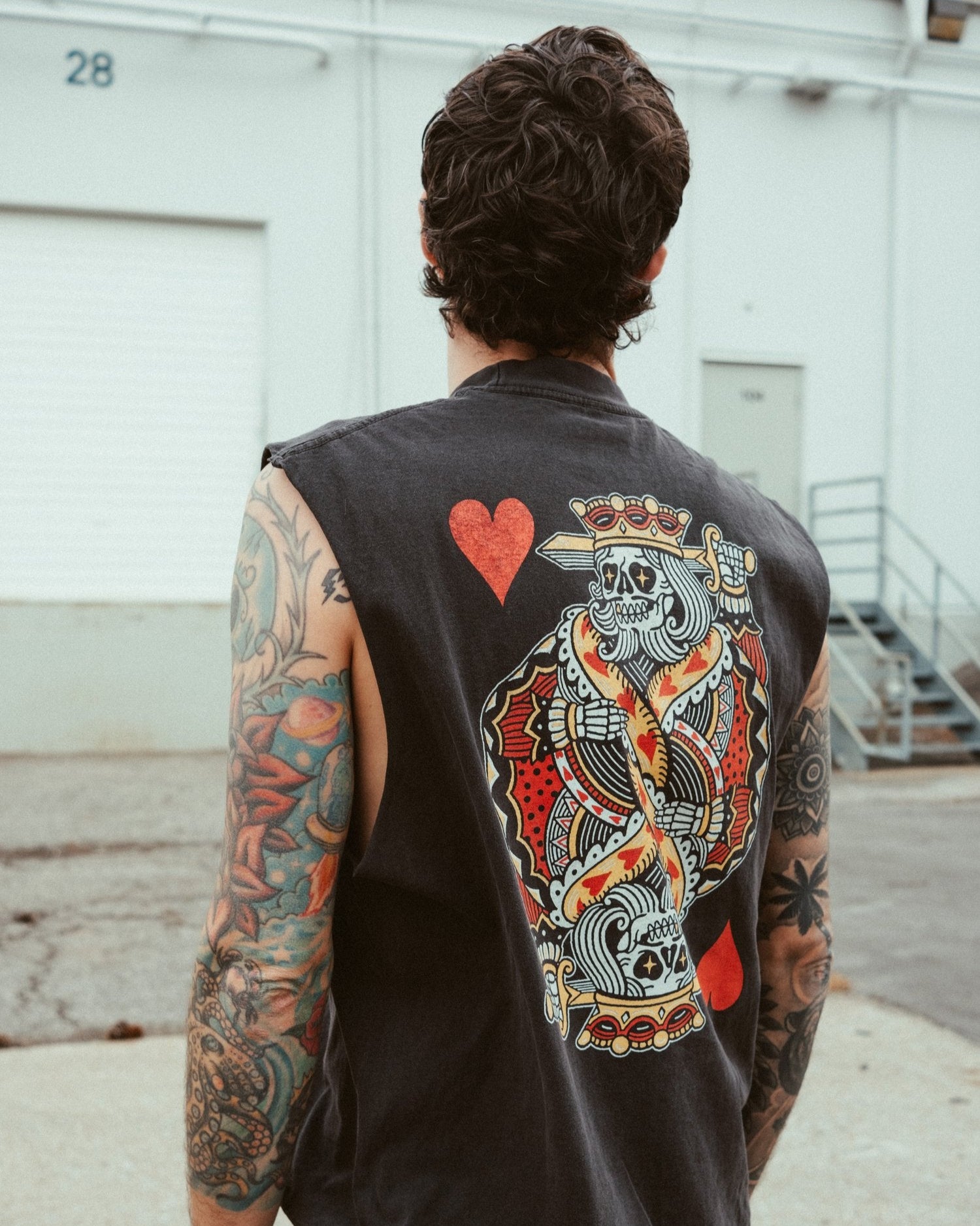 This garment-dyed washed black tee with raw-hemmed cut off sleeves and distressed graphics is serving 100% favorite vintage tee vibes with 0% musty stank or previously-owned stains. It’s essentially perfection. We said it.