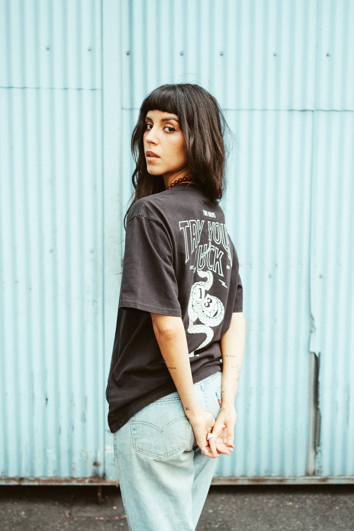 Our Try Your Luck heavyweight tee has a garment dyed finish, boxy oversized fit and dropped shoulders. This tee features hand-drawn front and back graphics and its color and shape hold up wash after wash.